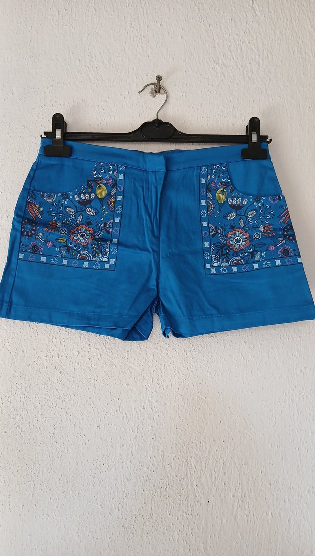 Rahat kesim mavi mini şort, renkli nakışlı cepler ve düğme detaylarıyla, yumuşak tekstil kumaştan, açık hava kullanımı için uygun.
