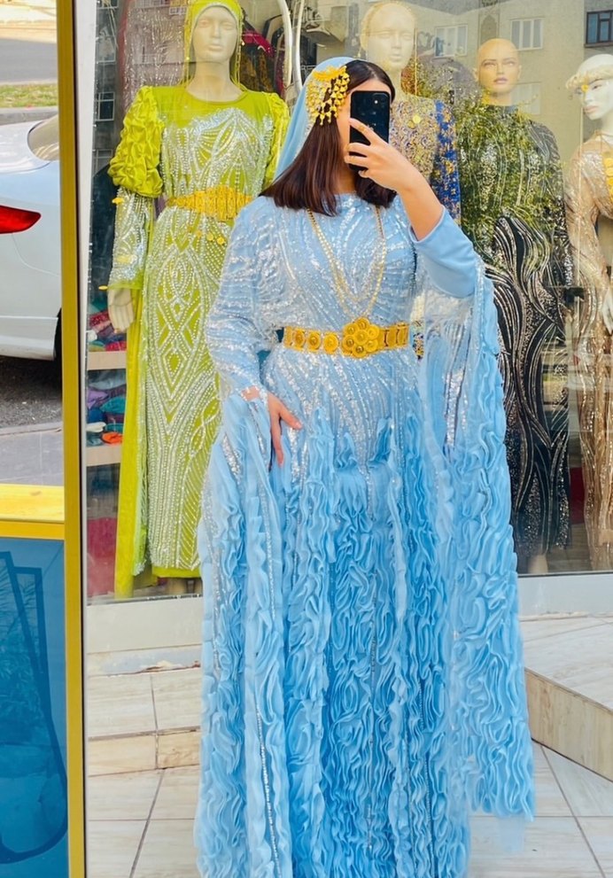 Bol kesim, uzun kollu, renkli nakışlı bohem tarzı elbise. Dökümlü tasarımıyla düğünler için uygun.