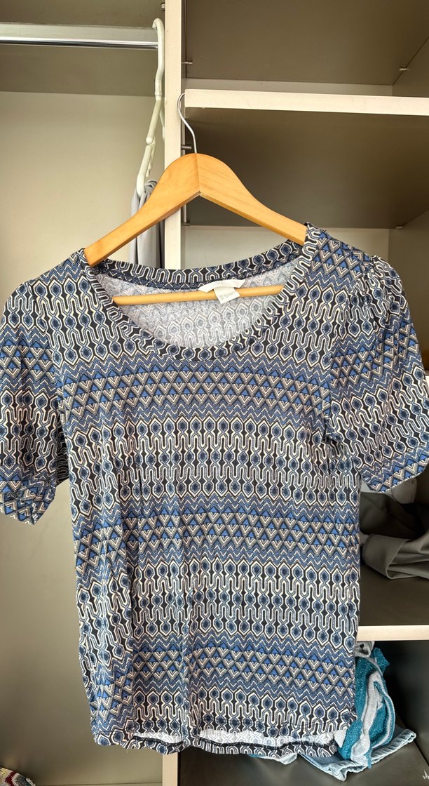 Bohem tarzda, kısa kollu ve yuvarlak yakalı, mavi örgü desenli bol kesim hamile bluz. Günlük kullanım için uygundur.
