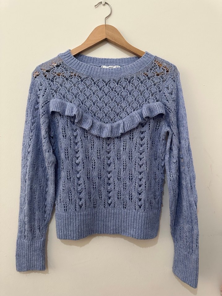 Mavi örgü, uzun kollu, bisiklet yaka, nakışlı desenli, bol kesim bohem tarzda kadın kazak.
