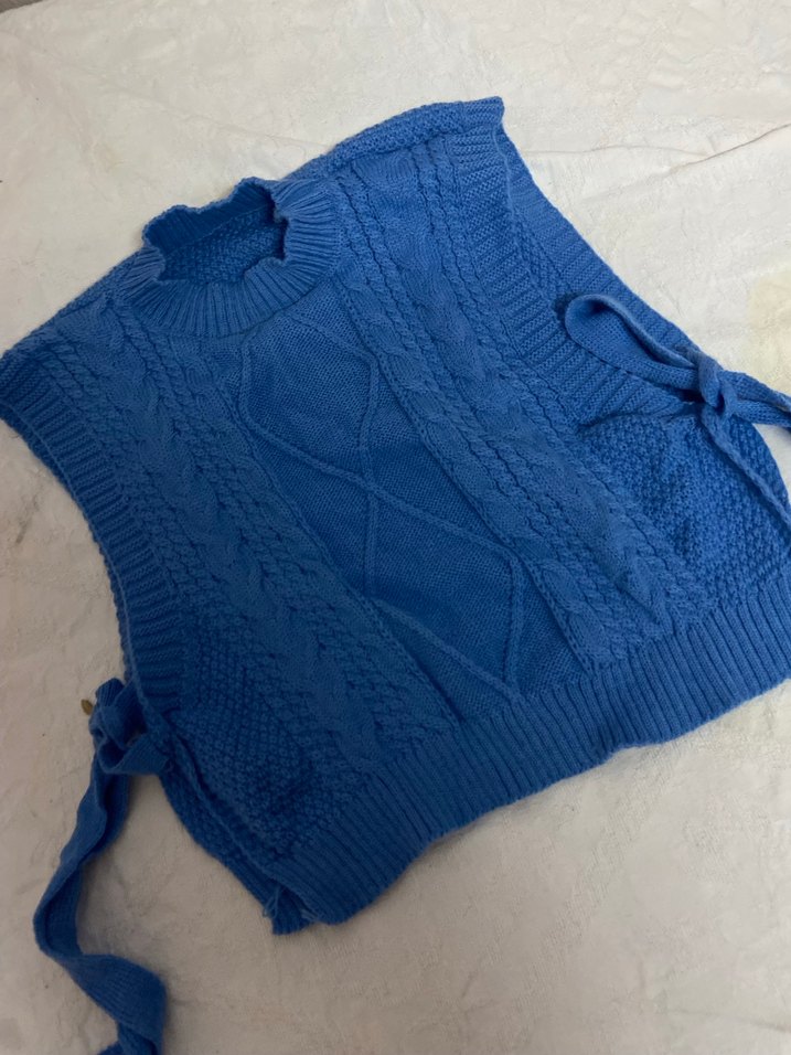 Koyu mavi örgü kadın süveter, bohem tarzda, balıkçı yaka ve kolsuz, yan bağcık detaylı, bol kesimdir.