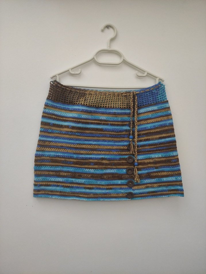 Bohem tarzda, gevşek kesim ve örgü dokulu, koyu mavi ve kahverengi çizgili mini etek. Günlük kullanım için uygundur.