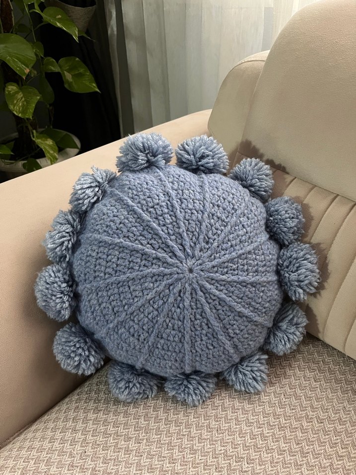 Yuvarlak formda, bohem tarzda, yumuşak örme dokulu ve çevresi mavi ponponlarla süslenmiş kırlent. L koltuğum için örmüştüm,odamızı değiştirdiğimiz için çok kısa bir süre süs olarak kullandık.Fazlalık nedeniyle satıyorum.