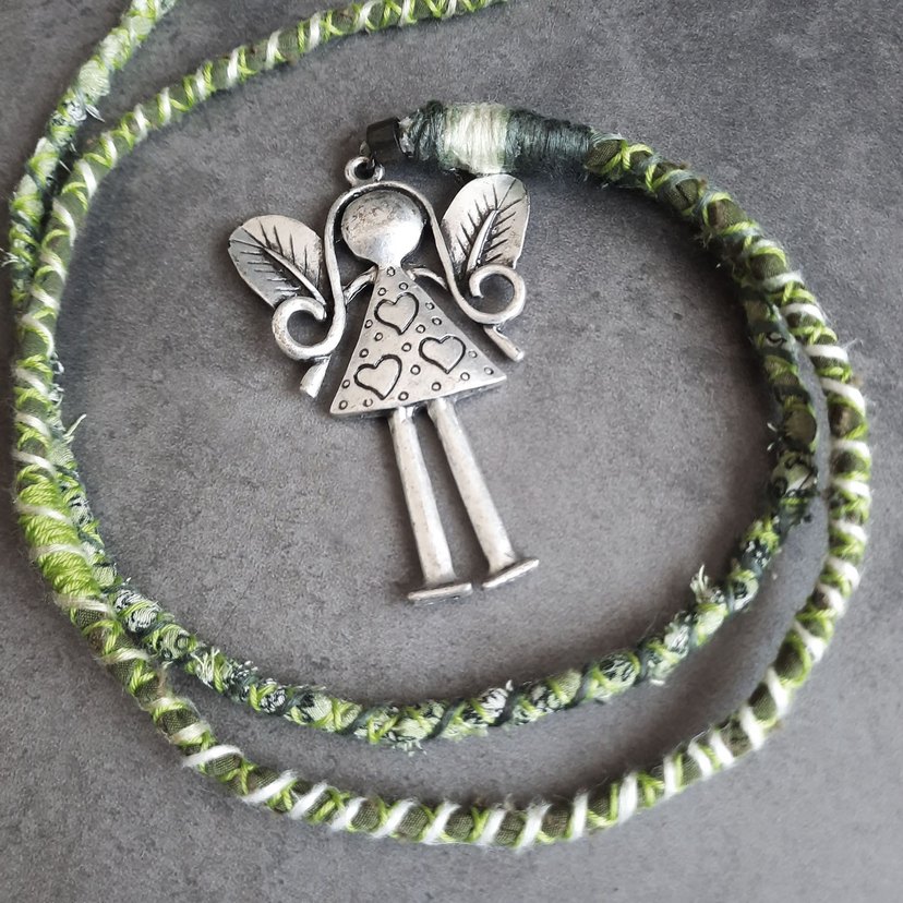 Gri ve yeşil işlemeli kumaş zincire bağlı, kalp desenli melek figürlü kadın charm, bohem tarzını yansıtır.