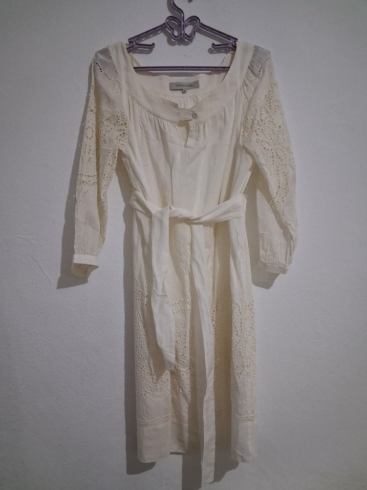 Bol kesim, bohem tarzı midi elbise, açık beyaz renkte, uzun kollu ve zarif kesim detaylara sahip. Belden bağlama detayı bulunur. Marka temsilidir