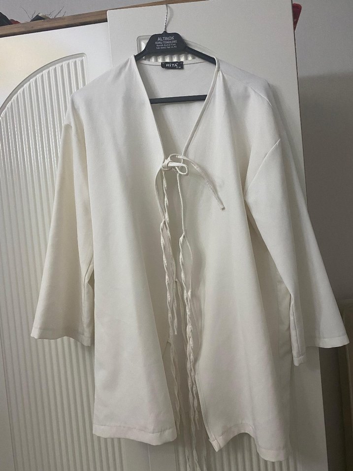Gevşek kesim, midi boy beyaz sabahlık, uzun kollu ve minimalist bohem tarzda. Basit bağlama detayı ve desen içermeyen tasarım. urun beden s m l bedenede olur