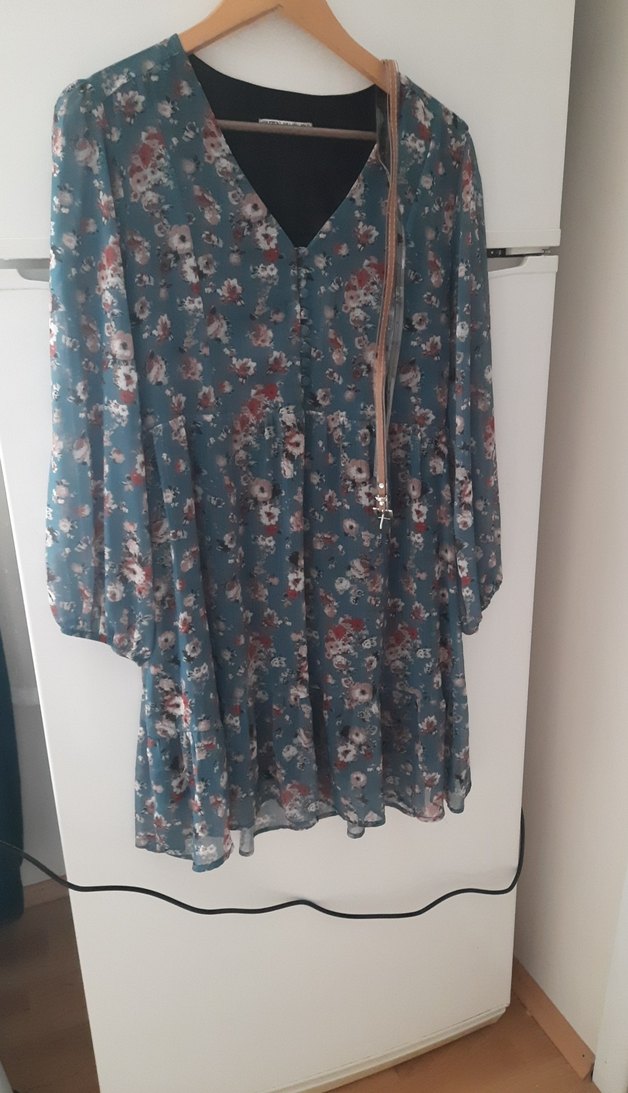 Bol kesim, askılı kollu, halter yakalı bohem midi elbise. Çiçek desenli, kuşaklı ve sentetik kumaş. Günlük kullanım için uygundur.