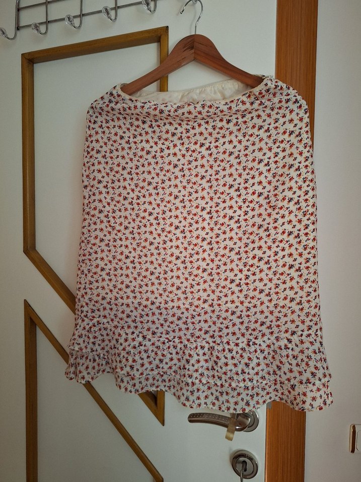 Hafif beyaz sentetik kumaştan, bohem tarzı için uygun, çiçek desenli, bol kesim ve drapeli midi etek. 36-38 bedene uygun yazlik etek