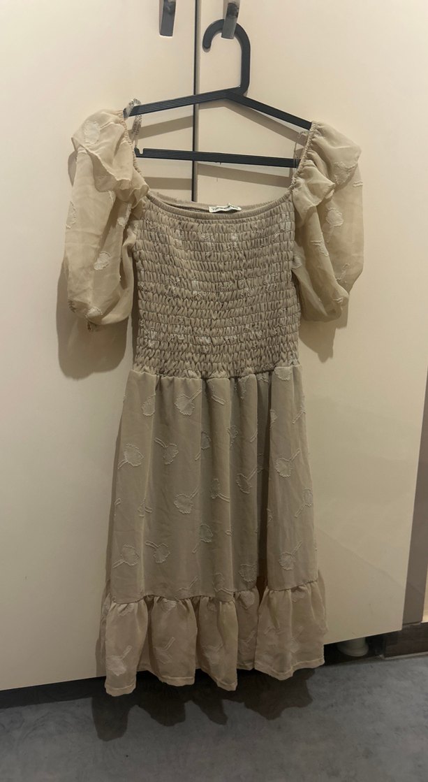 Bej renkte, nakış detaylı midi elbise. Yumuşak keten kumaştan, volanlı ve askılı kollu, bol kesim bohem tarzda.
