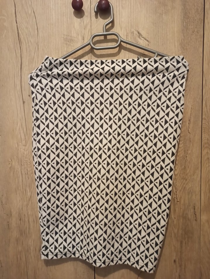 Günlük kullanım için bohem tarzda, beyaz ve gri renklerde geometrik desenli, örme dokulu bol kesim midi etek.