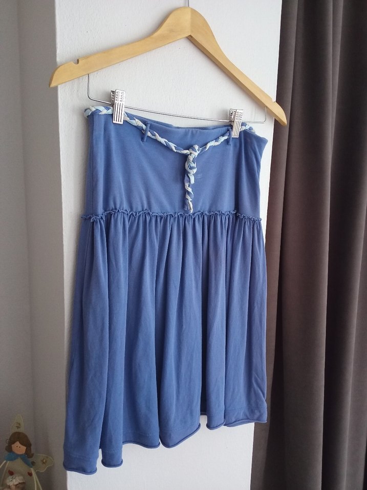 Mavi penye kumaştan, bol kesim ve drapeli bohem tarzı midi etek. Desensiz ve günlük kullanıma uygun.