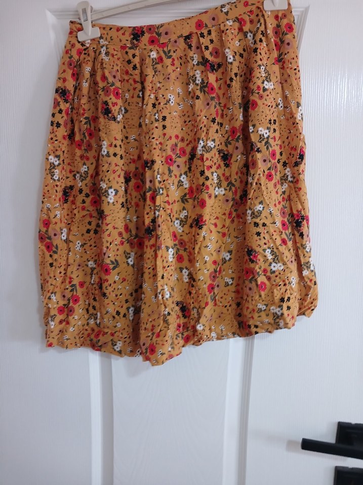 Yumuşak kumaştan, bohem tarzda, volan detaylı ve koyu bej çiçek desenli bol kesim midi hamile eteği.