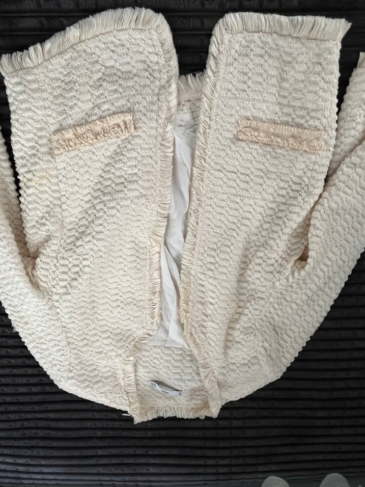 Örgü dokulu, kesik yaka ve uzun kollu bu kadın ceket, bol kesim ve midi boydadır. Beyaz renkte, bohem tarzda günlük kullanıma uygundur.