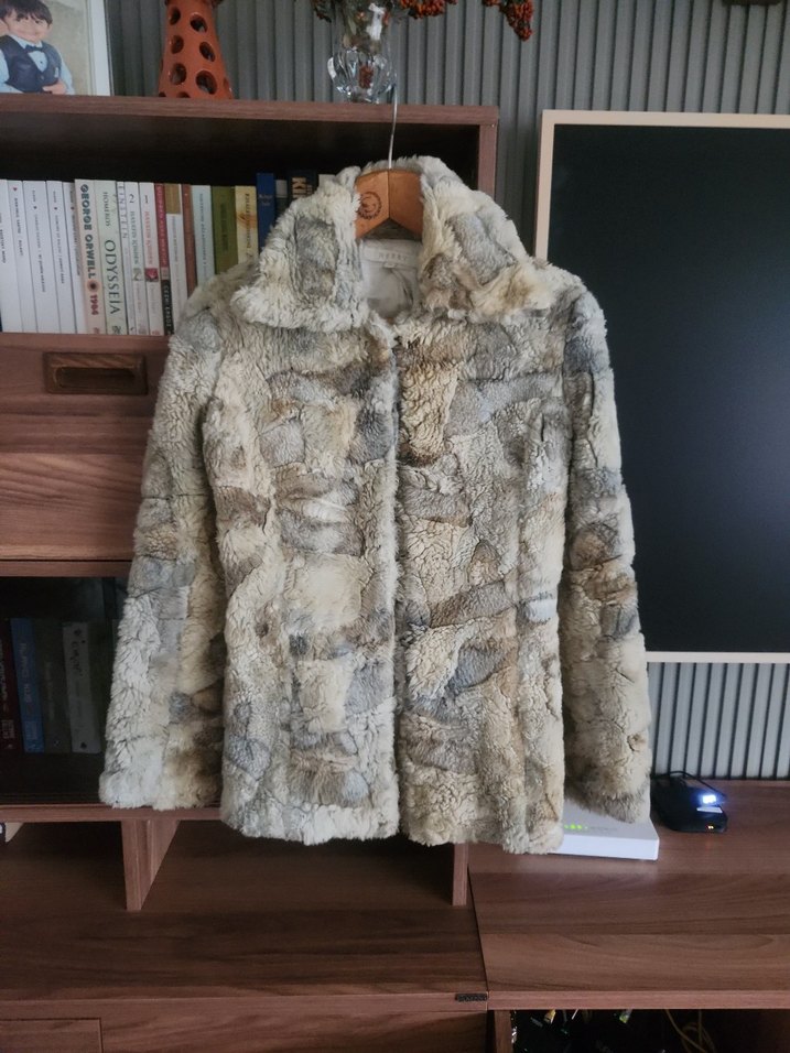 Bej bohem tarzı suni kürk ceket, uzun kollu, yaka detaylı ve bol kesimdir. Baskılı desene sahip olup günlük kullanıma uygundur.