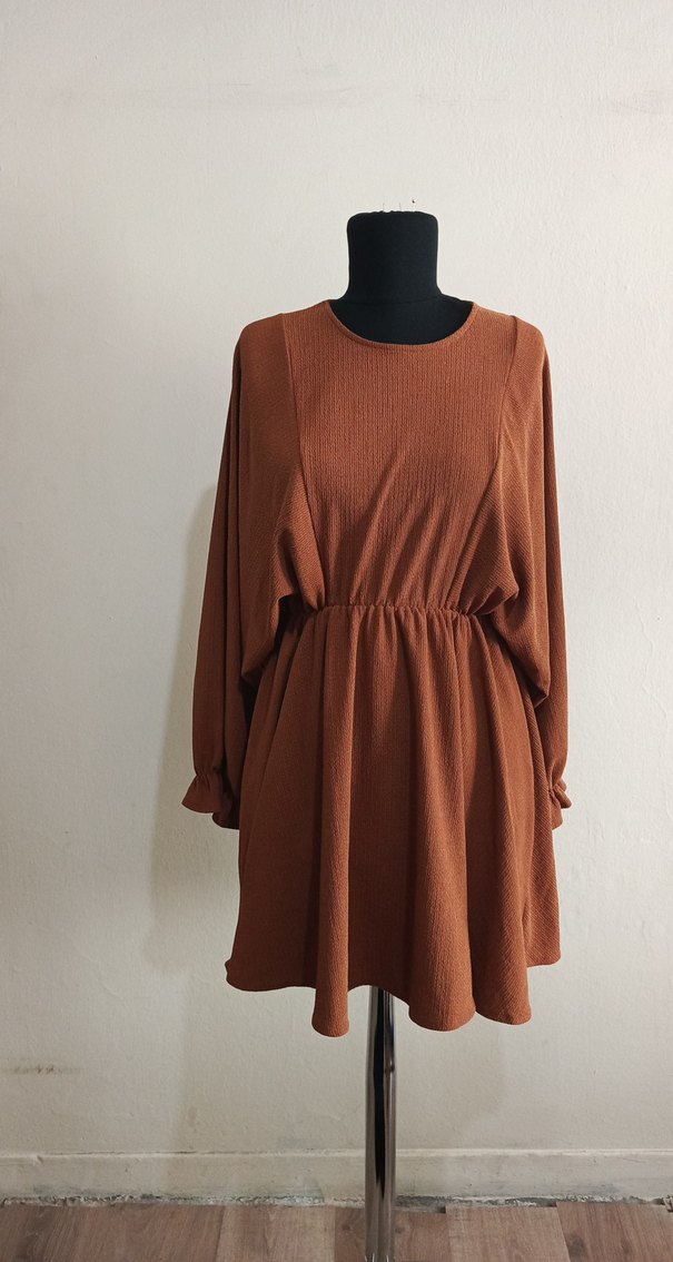 Bohem tarzda, kahverengi midi boy, pileli detaylı, uzun kollu rahat kesim kadın tunik. Yumuşak sentetik kumaştan, yuvarlak yakalı.