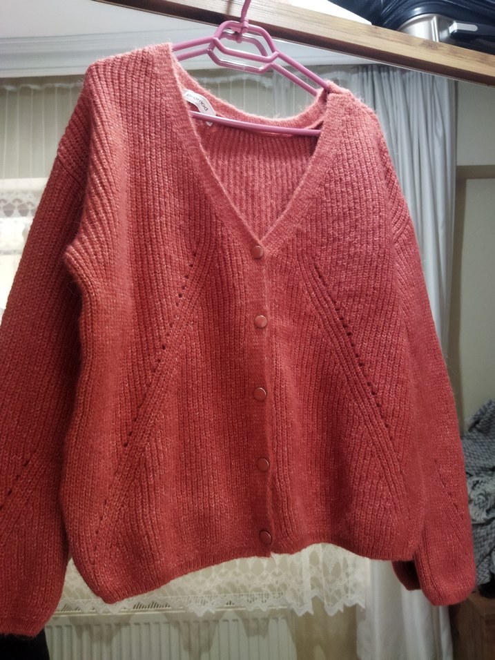 Yumuşak örgüden, bol kesim, V yaka, uzun kollu midi uzunlukta pastel kırmızı bohem tarzda kadın hırka. yenidir hiç giyilmedi