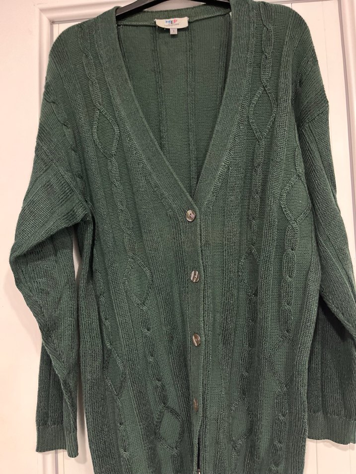 Yeşil renkli, bol kesim, uzun kollu, yakalı midi örgü kadın hırka. Günlük kullanıma uygun, rahat ve bohem tarzda. Koltuk altı 54cm/boy 73 cm Gerçek sedef düğmeli şık tasarım
