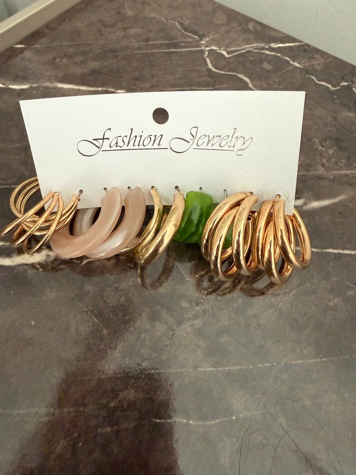 Pastel altın renkli, kısa boylu elastik bohem tarzı küpe seti. Düğün ve retro tarzlar için uygun. Üzerinde "fashion Jewelry" yazısı bulunur.