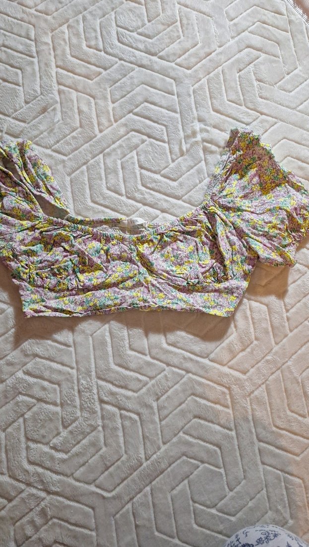 Bohem tarzda, tekne yakalı ve askılı kol detaylı mini bluz. Pastel renkli batik desenli, vücuda oturan ve fırfırlı tasarım, yumuşak sentetik kumaştan yapılmıştır.