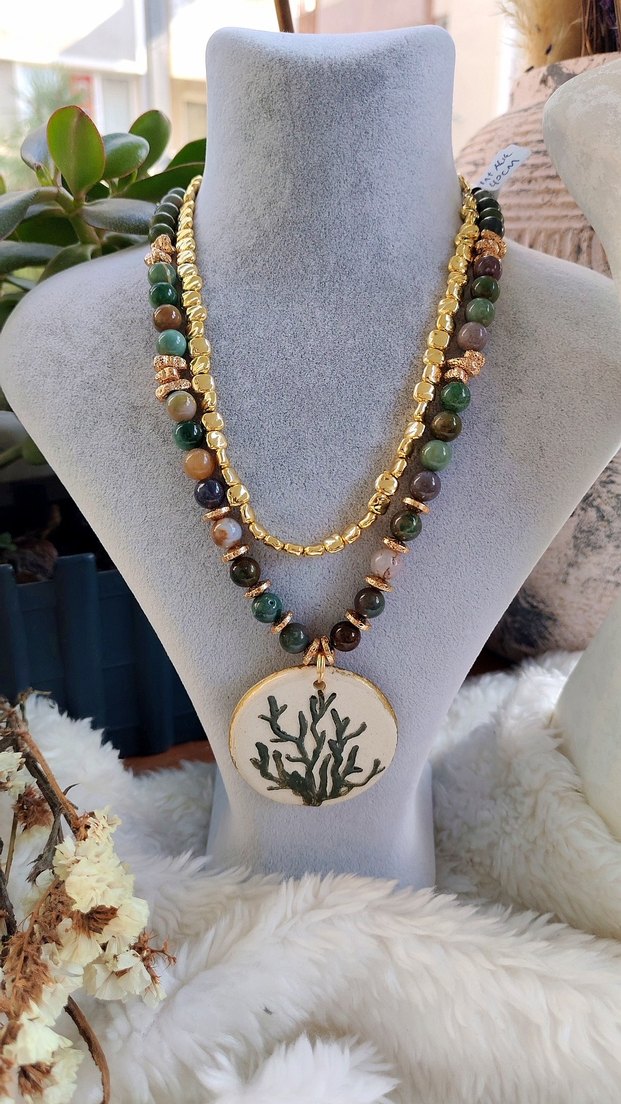 Renkli boncuklar ve doğadan ilham alan yuvarlak bir kolye ucu içeren bohem tarzda kısa kolye. Günlük kullanım için uygun. Doğal Taş kullanıldı.
