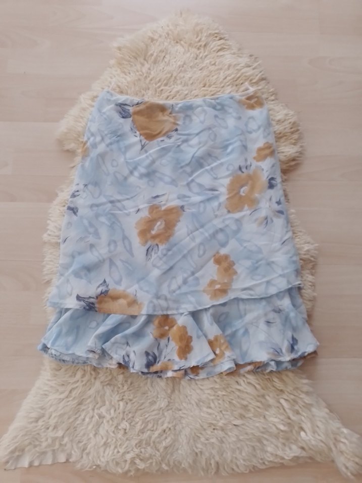 Bol kesim, kısa volan detaylı. Pastel mavi tonlarda batik desenli, yumuşak sentetik kumaştan yapılmıştır.