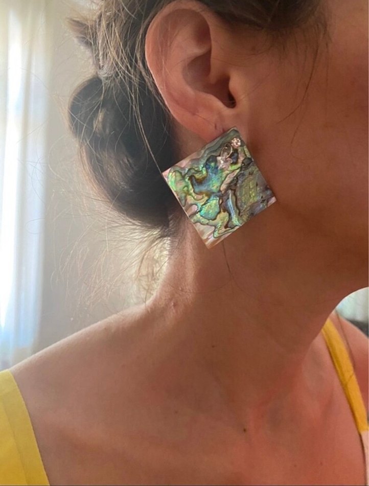 orjinal sedef Bohem tarzda mini kare küpe, pastel tonlarda doğal taş ve boncuklu dokusuyla açık hava kullanımı için uygun.