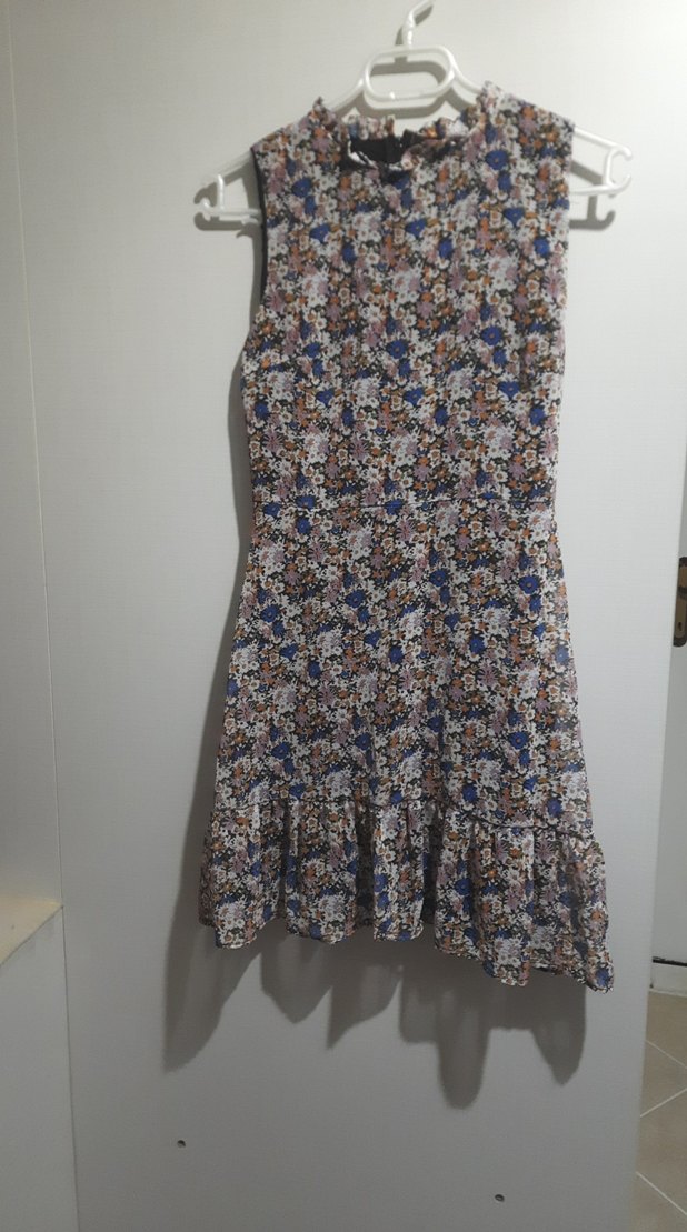 Kolsuz, bohem tarzda mini elbise. Yüksek yakalı, vücuda oturan kesim ve fırfırlı etek ucu, çok renkli çiçek desenli, yumuşak sentetik kumaştan yapılmıştır.