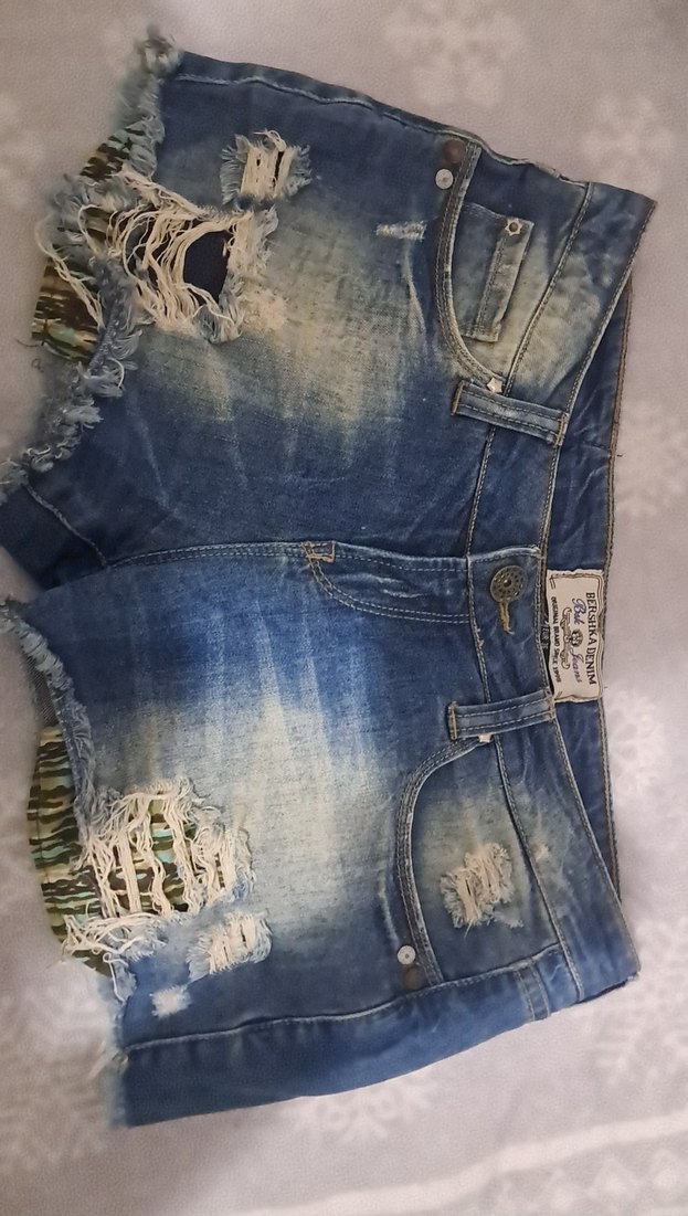 Düğmeli, bol kesim mini kot şort. Parlak mavi renk, yırtık ve tie-dye desenli. Günlük kullanıma uygun.