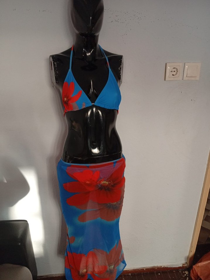 Canlı mavi ve kırmızı çiçek desenli, bağlamalı mini bohem pareo. Drapeli ve ince askılı tasarımıyla günlük kullanıma uygun.