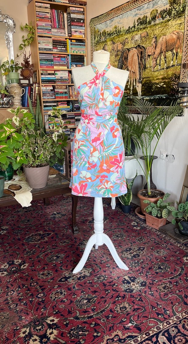 Fitted kesim, pastel çok renkli desenli, straplez yaka ve drapeli detaylara sahip bohem mini elbise, romantik akşamlar için ideal. Astarlı