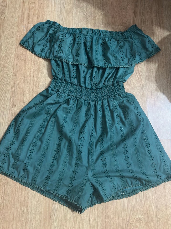 Sentetik kumaştan, nakışlı ve fırfırlı, bol kesim bohem mini tulum. Romantik akşamlar için uygundur. zümrüt yeşili