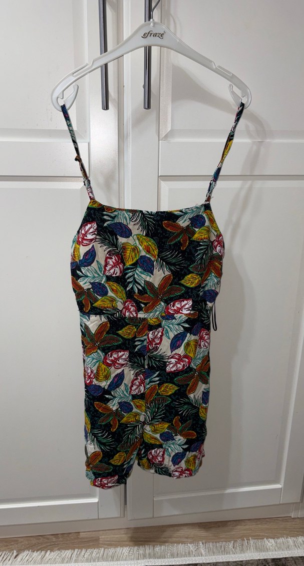 Çok renkli yaprak desenli, ince askılı ve fermuarlı, bohem tarzda kısa ve dar kesim tulum.