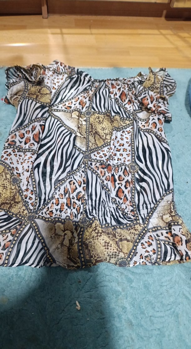 Kısa kollu, fırfırlı, balıkçı yaka ve mini boy, bohem tarzda, çok renkli zebra desenli, sentetik kumaştan yapılmış dar kesim bluz.