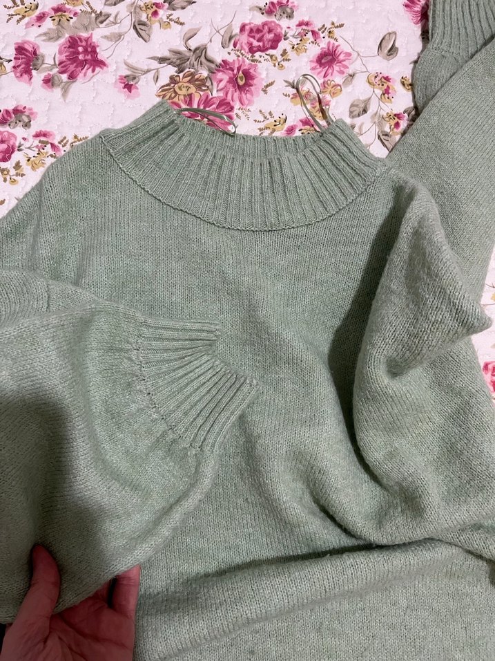 Mint yeşili renkli, bohem tarzında triko kazak. Yuvarlak yaka, uzun kollu ve rahat bol kesimdir. Günlük kullanım için uygundur.