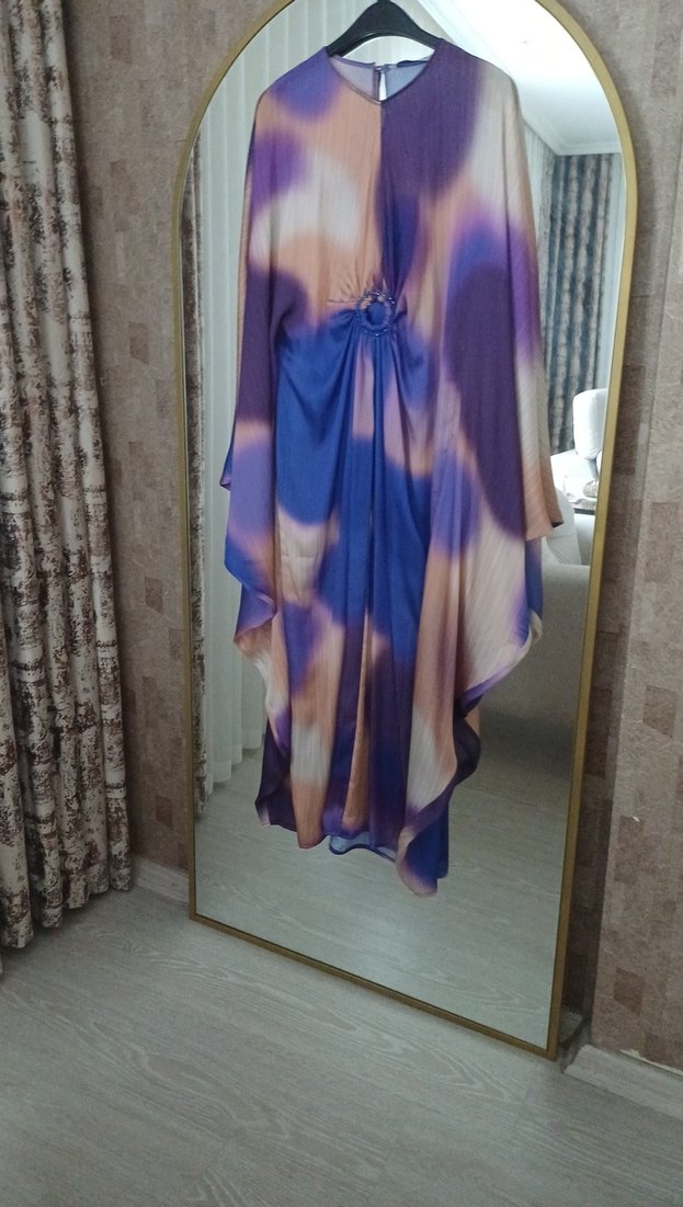 Uzun boy, bol kesim bohem elbise, v yaka ve ince askılıdır. Açık mor batik deseniyle drapeli ve akışkan bir görünüme sahiptir.