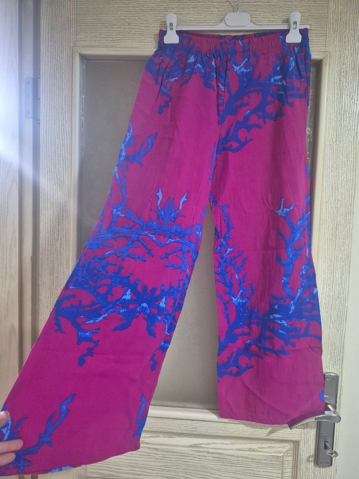 Renkli mor batik desenli, bol kesim uzun kadın pantolonu. Dökümlü yapısıyla bohem tarzı yansıtır, dış mekan kullanımına uygundur.