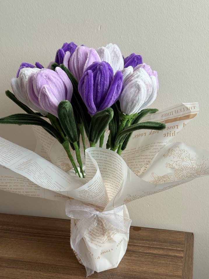Mor ve beyaz kadife çiçeklerden oluşan bohem tarzda buket, baskılı kağıt ve tül kurdele ile sarılmıştır.