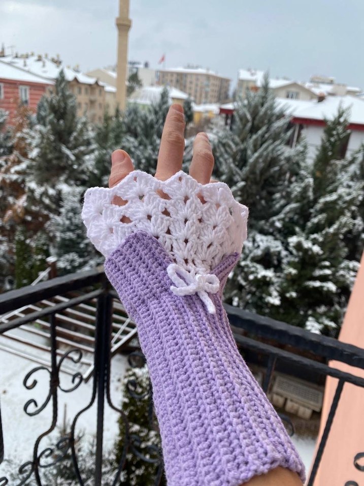 Bohem tarzda, mor ve beyaz renklerde, örgü ve dantel detaylı rahat kadın eldiveni, küçük fiyonk süslemeli.
