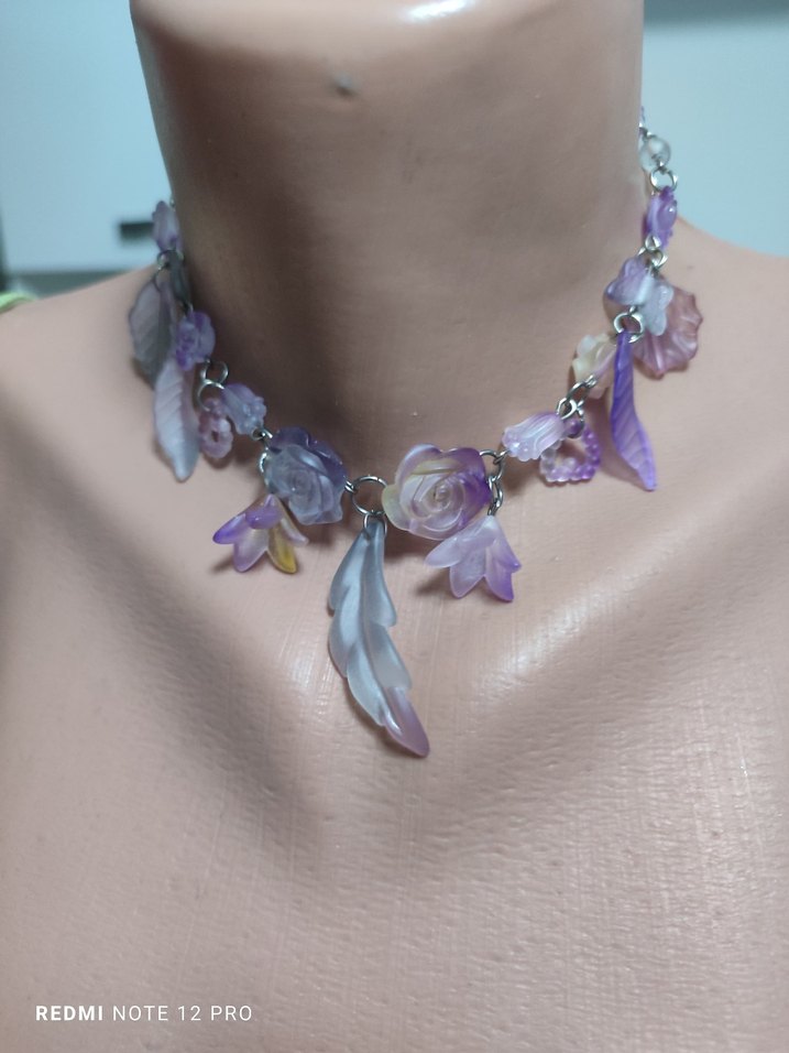 Bohem tarzda, pastel mor boncuklar ve çiçek desenli, tüy şeklinde süslemeli, günlük kullanıma uygun midi uzunlukta kolye.