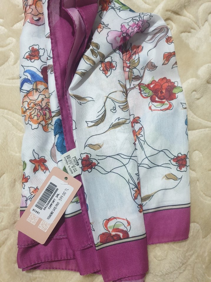 Pastel çiçek desenli, mor kenarlı, bohem tarzda kadın şal. Yumuşak sentetik kumaştan, drapeli tasarım rahatlık sağlar. 600 tlye aldım uygun vericem