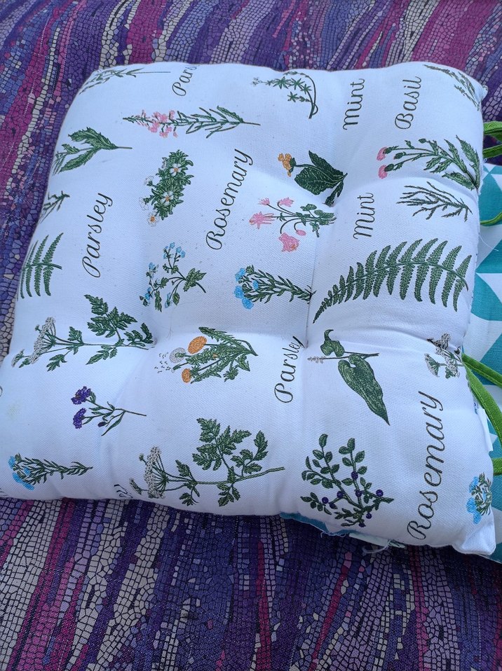 Pastel mor renkte, bohem çiçek desenli yastık. Kekik, nane gibi bitkilerle süslenmiş, yumuşak ve rahat dokulu.