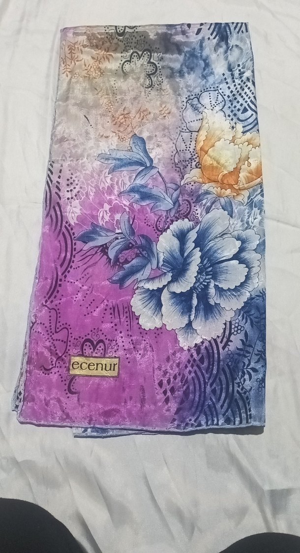 Sentetik kumaştan, bohem tarzda, mor tonlarında çiçek desenli, drapeli kadın şalı. Üzerinde 'ecenur' etiketi bulunur.