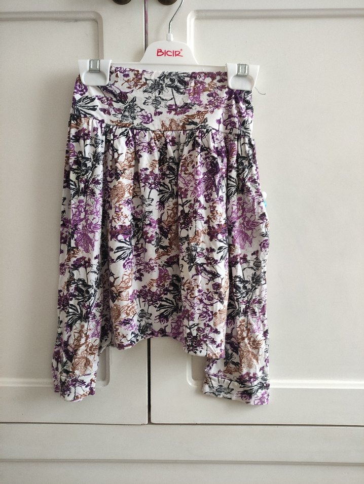 Mor ve gri tonlarında bağlama desenli, bol kesim ve drapeli, sentetik kumaştan mini hamile eteği.