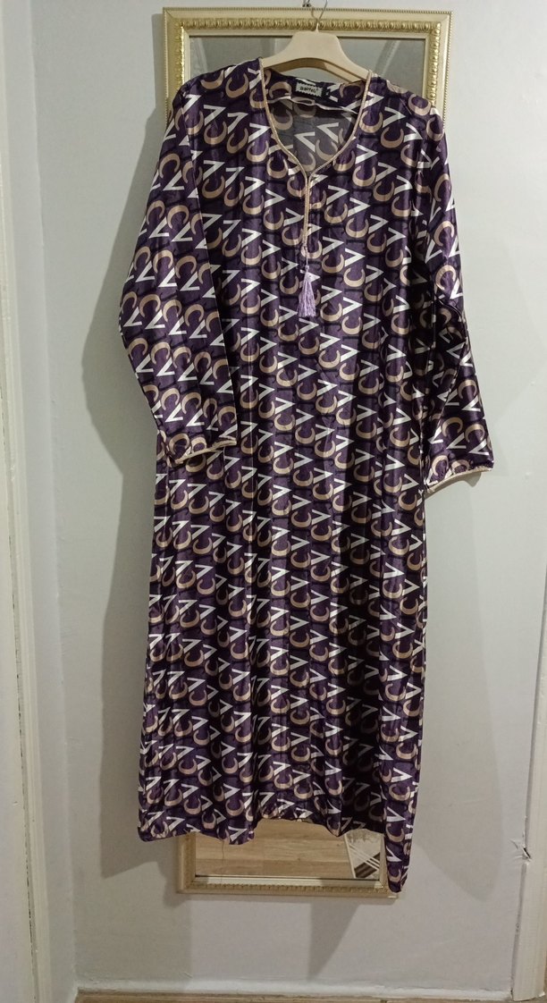 Bohem tarzda, uzun kollu ve tekne yaka, mor renkli bağlama desenli, plise detaylı, sentetik kumaştan bol kesim uzun elbise.