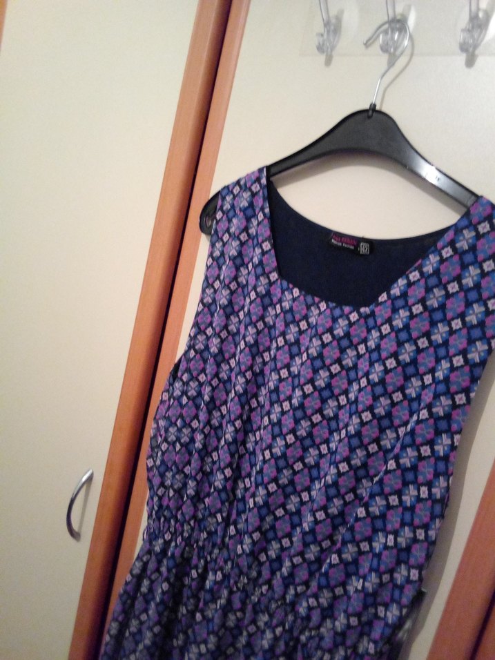 Mor renkli, bağlama desenli, kolsuz hamile elbisesi. Yuvarlak yaka, bol ve midi boyda, düğmeli detaylı bohem tarzda günlük kullanım için uygun.