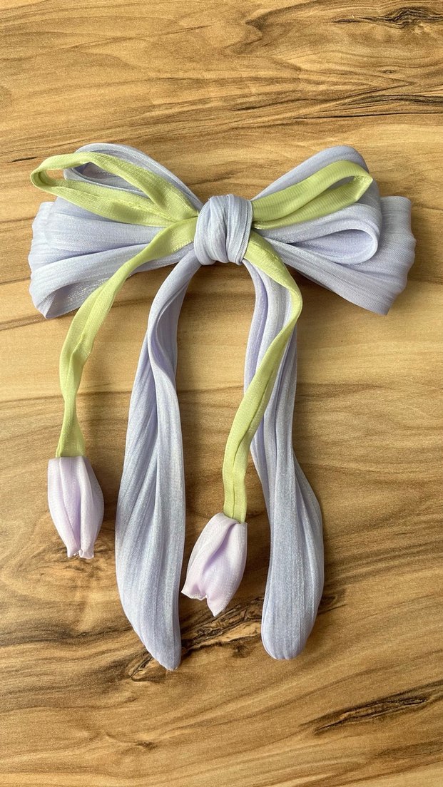İpek gibi yumuşak kumaştan yapılmış, yeşil detaylı pastel mor fiyonk saç aksesuarı, bohem tarzını yansıtıyor.