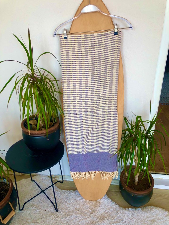 Bohem tarzda, mor ve gri çizgili, püsküllü kenarlı, yumuşak ve hafif peştemal.