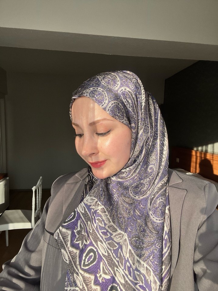 Kadınlar için bohem tarzda, mor ve gri tonlarında desenli, dökümlü sentetik kumaştan şalÜzerinde LOCELLA etiketi bulunur.
