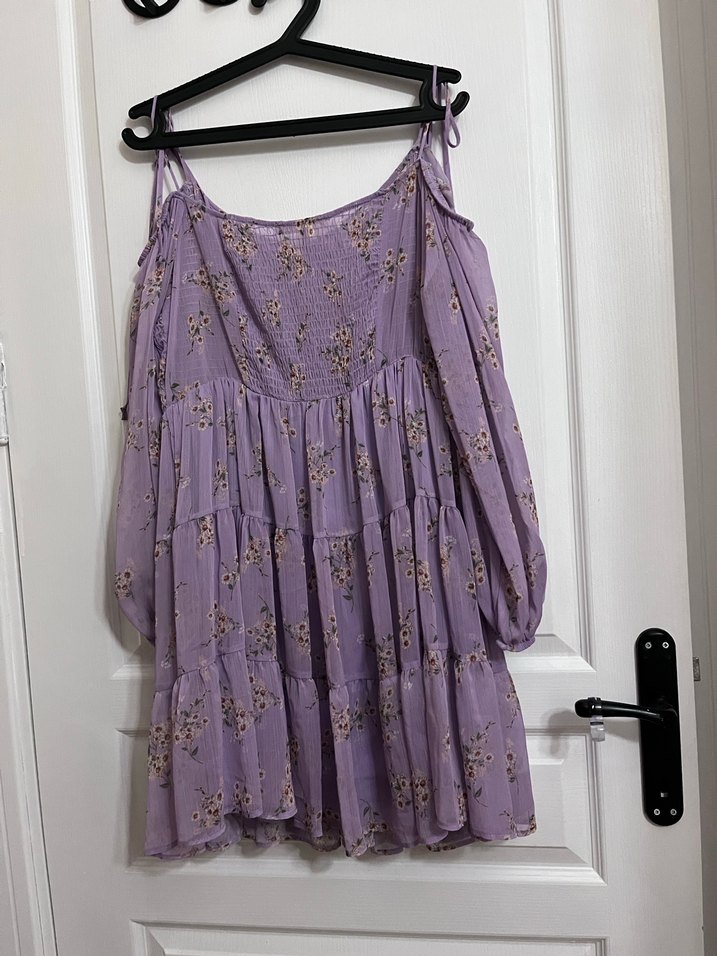 Bohem tarzda, askılı ve fırfırlı detaylara sahip, gevşek kesim mor mini elbise, pastel batik desenlidir. Romantik akşamlar için uygundur.