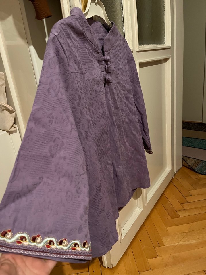 Mor renkli, nakış detaylı Düğmeli, yakası kesik ve bol kesimdir. Günlük kullanım için bohem vintage tarzı sunar.